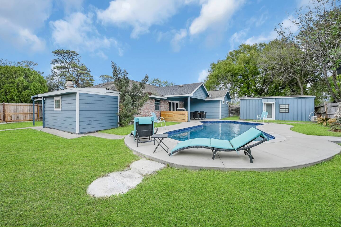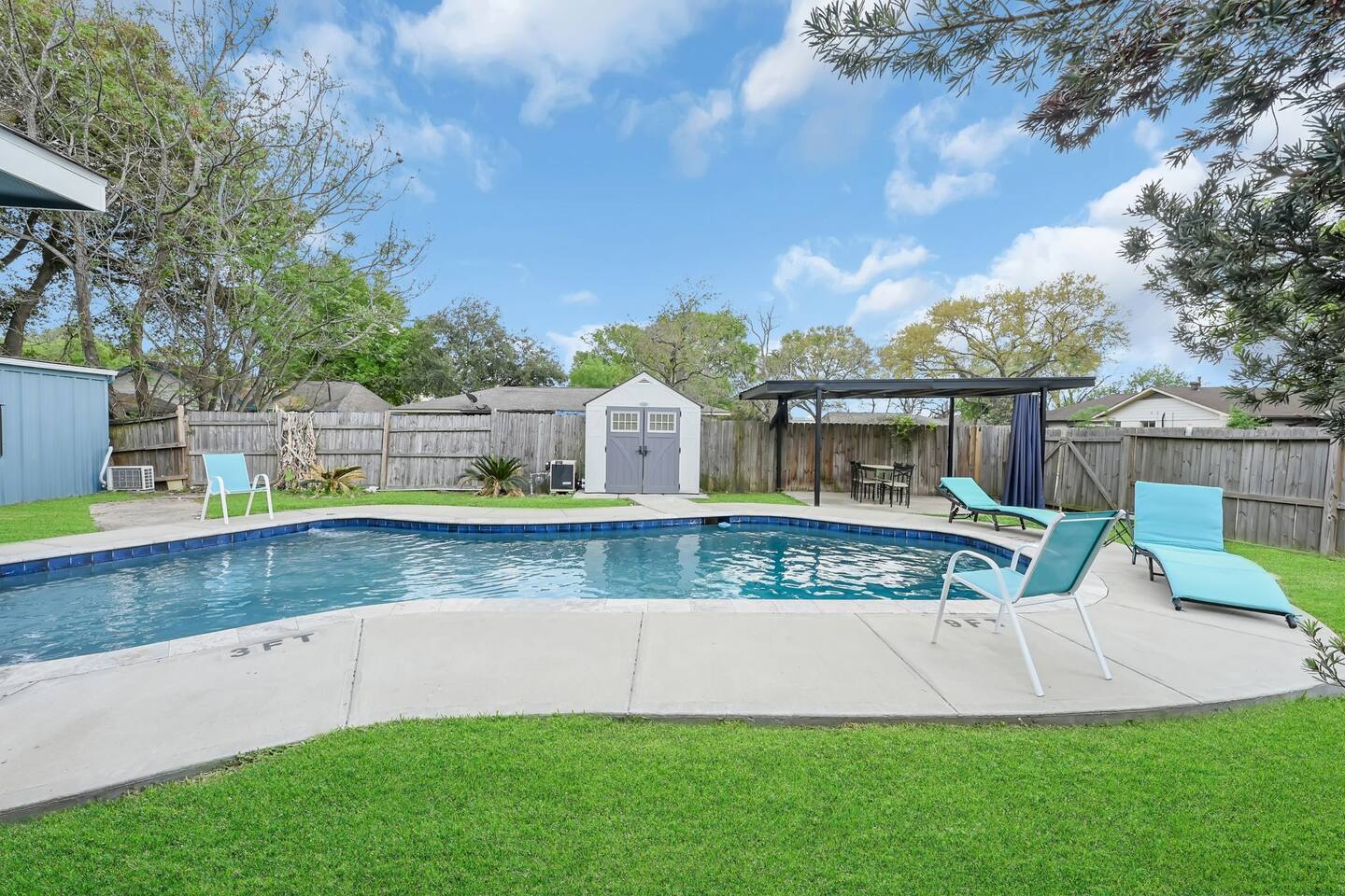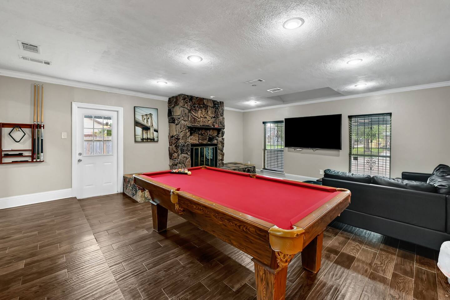 The Space ⭐ Top Highlights Guests Love Private Swimming Pool – Perfect for relaxing, swimming, and family fun Outdoor BBQ & Patio – Ideal for cookouts, gatherings, and evening relaxation Entertainment Ready – Pool table + 6 TVs throughout the home 5 Spacious Bedrooms – Comfortable beds for restful nights 4 Full Bathrooms – Stocked with essentials for convenience Fully Equipped Kitchen – Modern appliances, cookware & dining essentials Unique Container Suite – 5th bedroom & 4th bath in a private backyard container home Bedrooms & Layout 5 private bedrooms (ideal for families & groups) Separate container-style guest suite for added privacy Designed to comfortably host large groups without crowding Location & Accessibility 📍 Prime Houston Location 20 minutes to Downtown Houston 28 minutes to George Bush Intercontinental Airport (IAH) 44 minutes to Hobby Airport Close to the Medical Center, Museum District, dining, and shopping Perfect for guests who want easy access to Houston’s top attractions while enjoying a quiet, private stay. Guest Access Guests have exclusive access to the entire property, including the main house, private pool, outdoor patio, and container guest suite. Other Things to Note (Please Read) ❌ No dishwasher 📸 Outdoor security cameras monitor guest count (no indoor cameras) 🎉 Daytime gatherings up to 20 guests allowed with prior approval ($500 event fee) 🚫 Not suitable for large parties or unapproved events ❗ No refunds for rule violations 🌿 Home has a vintage 1970s charm with normal signs of age 🐜 Routine pest control in place (common for Houston homes) Important Policies No refunds or rescheduling for weather or personal health issues Trip insurance is highly recommended All events must be discussed and approved before booking Optional Extras ⏰ Early Check-In: Complimentary when available; extended early access may incur a $200 fee 👶 Child Amenities: Available via third-party rental providers Registration Permit/License #: STR-2025-000945