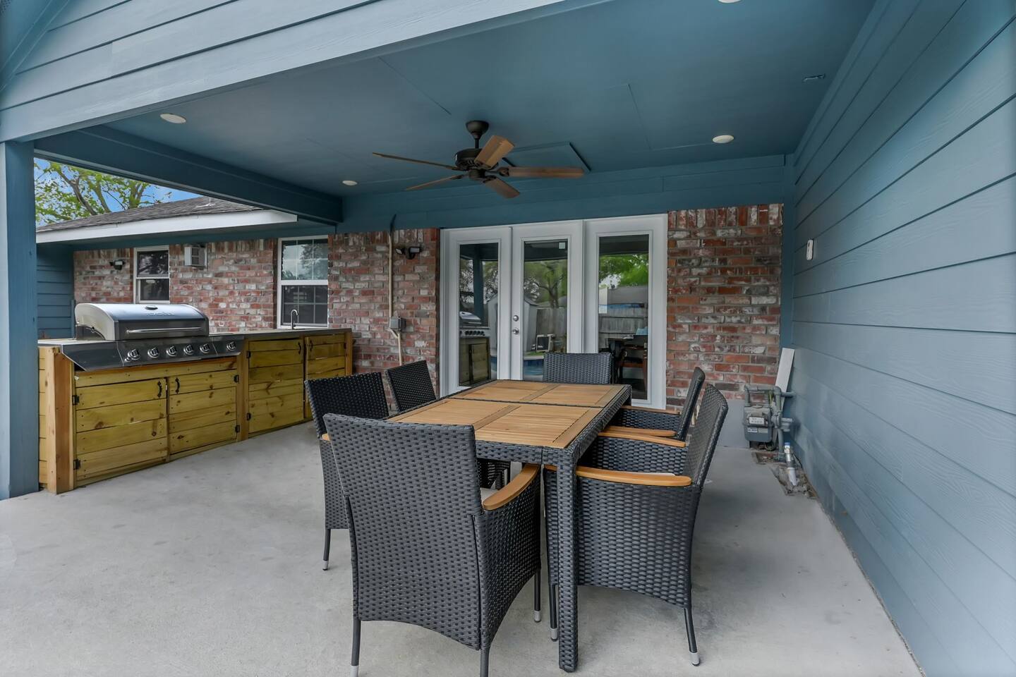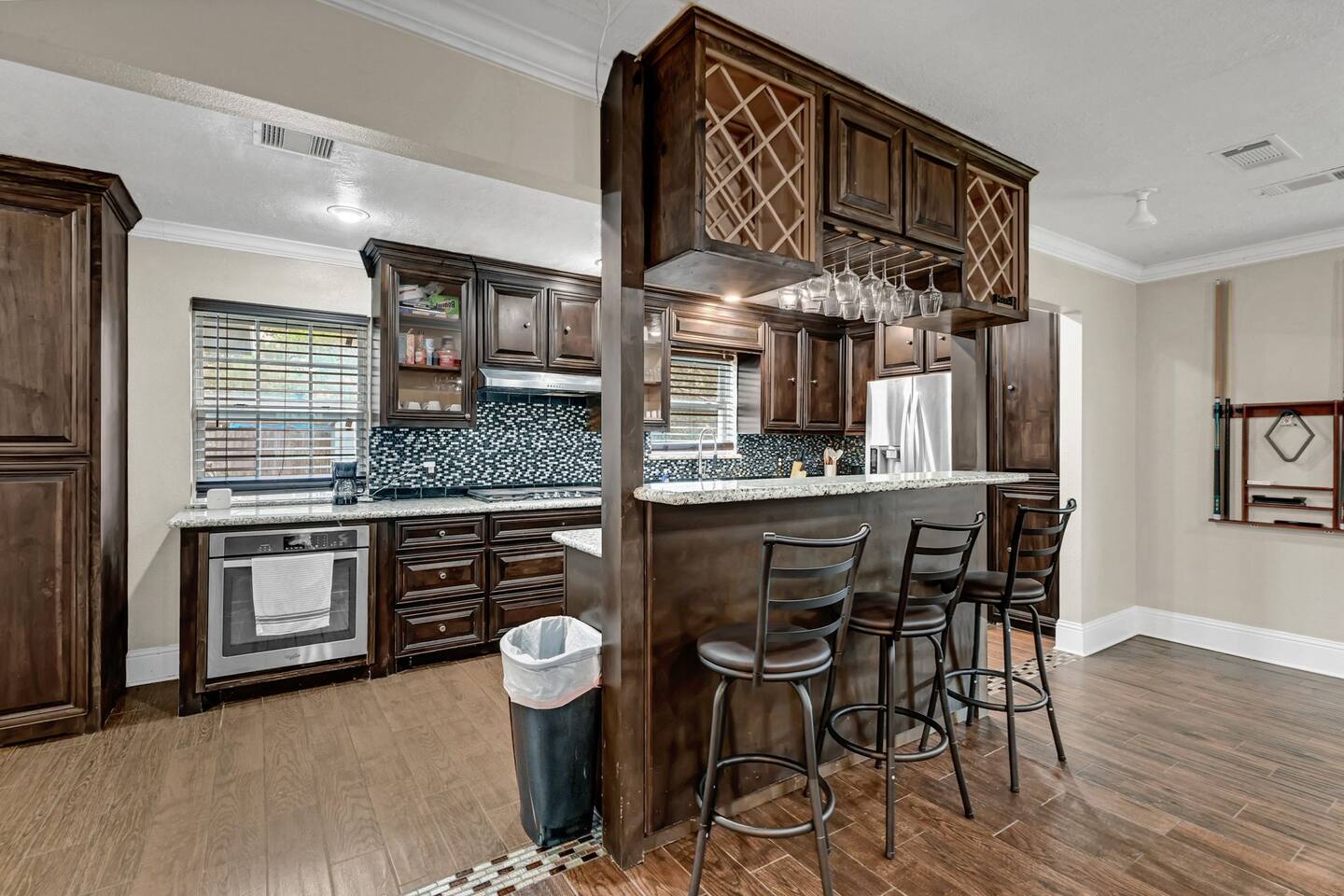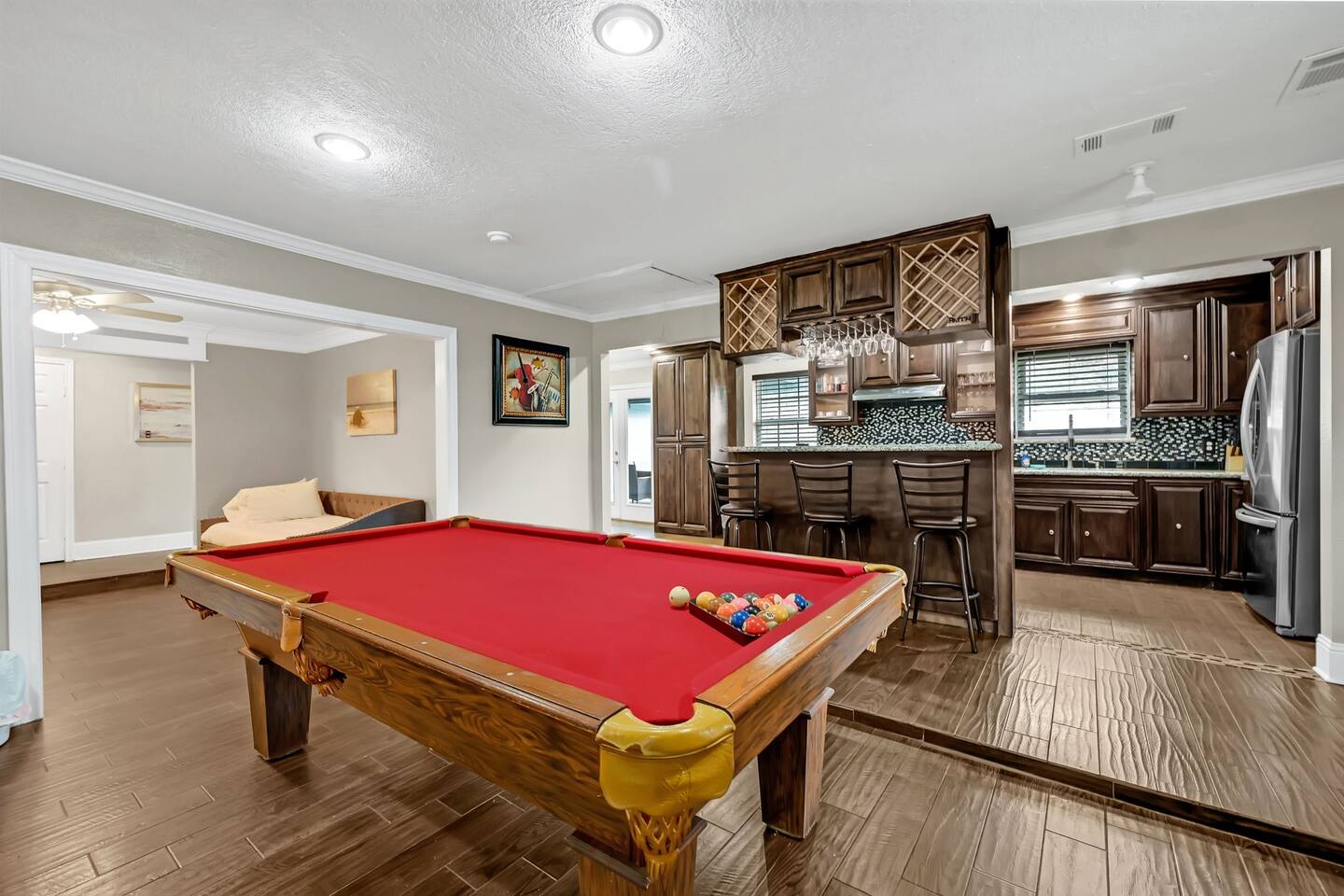 The Space ⭐ Top Highlights Guests Love Private Swimming Pool – Perfect for relaxing, swimming, and family fun Outdoor BBQ & Patio – Ideal for cookouts, gatherings, and evening relaxation Entertainment Ready – Pool table + 6 TVs throughout the home 5 Spacious Bedrooms – Comfortable beds for restful nights 4 Full Bathrooms – Stocked with essentials for convenience Fully Equipped Kitchen – Modern appliances, cookware & dining essentials Unique Container Suite – 5th bedroom & 4th bath in a private backyard container home Bedrooms & Layout 5 private bedrooms (ideal for families & groups) Separate container-style guest suite for added privacy Designed to comfortably host large groups without crowding Location & Accessibility 📍 Prime Houston Location 20 minutes to Downtown Houston 28 minutes to George Bush Intercontinental Airport (IAH) 44 minutes to Hobby Airport Close to the Medical Center, Museum District, dining, and shopping Perfect for guests who want easy access to Houston’s top attractions while enjoying a quiet, private stay. Guest Access Guests have exclusive access to the entire property, including the main house, private pool, outdoor patio, and container guest suite. Other Things to Note (Please Read) ❌ No dishwasher 📸 Outdoor security cameras monitor guest count (no indoor cameras) 🎉 Daytime gatherings up to 20 guests allowed with prior approval ($500 event fee) 🚫 Not suitable for large parties or unapproved events ❗ No refunds for rule violations 🌿 Home has a vintage 1970s charm with normal signs of age 🐜 Routine pest control in place (common for Houston homes) Important Policies No refunds or rescheduling for weather or personal health issues Trip insurance is highly recommended All events must be discussed and approved before booking Optional Extras ⏰ Early Check-In: Complimentary when available; extended early access may incur a $200 fee 👶 Child Amenities: Available via third-party rental providers Registration Permit/License #: STR-2025-000945