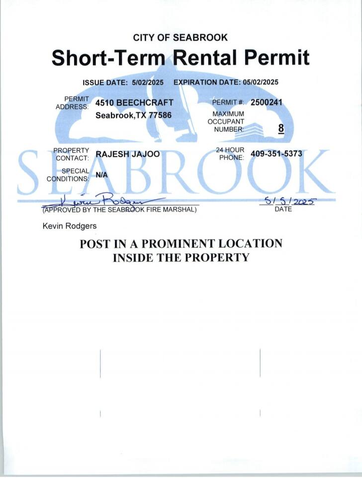 Welcome to our cozy and inviting 1984 home, perfectly located in the heart of Seabrook, Texas! With 4 bedrooms, 2 bathrooms, and space to comfortably accommodate up to 8 guests, this spacious getaway is ideal for families, groups, or anyone looking to experience the perfect mix of relaxation and adventure. Short term rental permit number 2500241. The property has gone through city planning and fire safety regulations and is approved for max 8 occupancy.